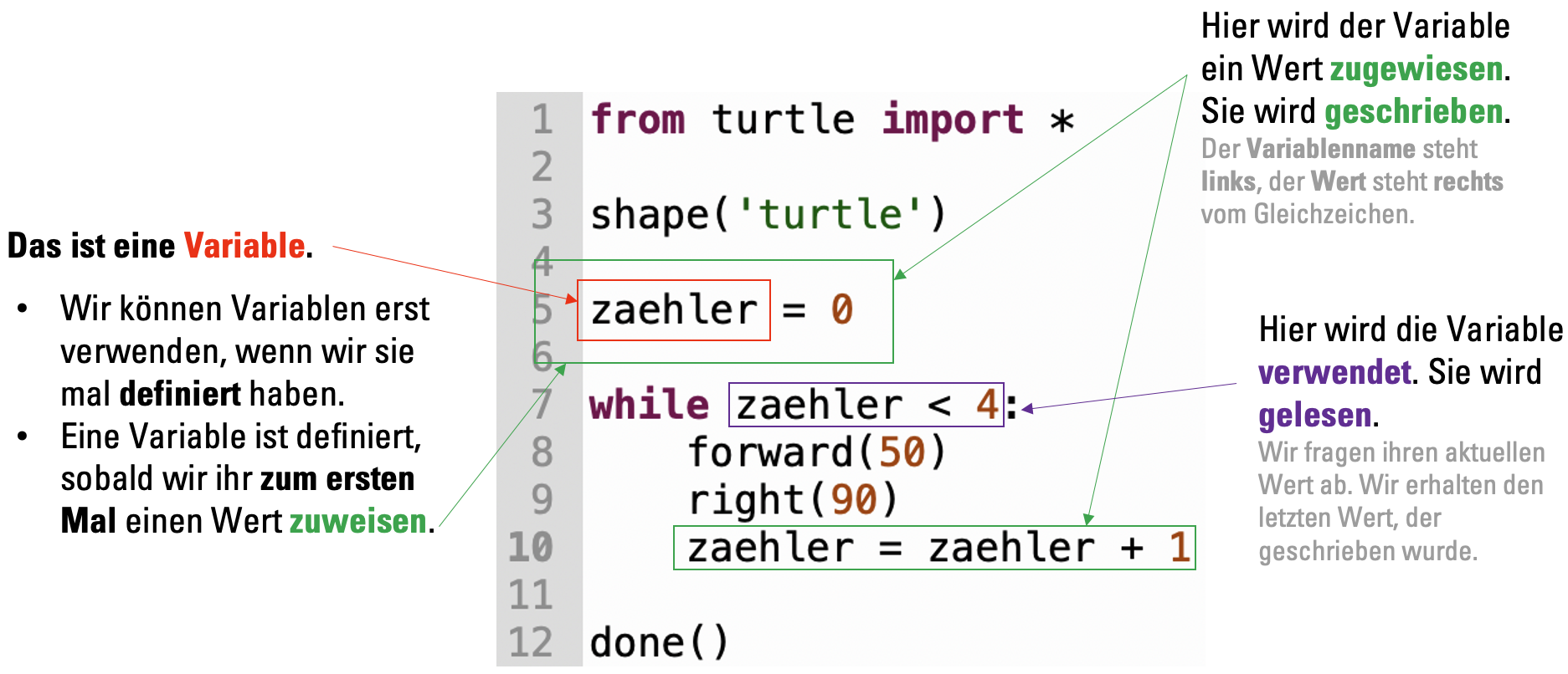 Denken Sie daran: Beim Programmieren ist zaehler = 0 keine Frage, sondern ein Befehl. Wir befehlen dem Computer, den Wert der Variable zaehler auf 0 zu setzen.